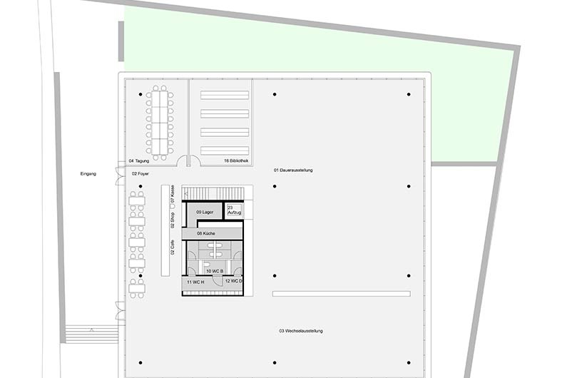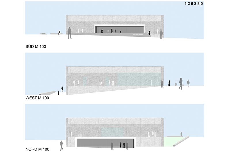 Die Räume des Dokumentationszentrums werden auf 2 Ebenen angeordnet. Die öffentliche, obere Ebene wird von einem straßenbegleitenden Vorplatz erschlossen. Über das Foyer und den Kassenbereich gelangt man direkt in die einzelnen Raumbereiche. Der Serviceblock ist frei in die obere Ebene eingestellt. Die Mitarbeiterräume, sowie Archiv, Depot und Technikräume befinden sich in der unteren Ebenen und werden durch einen separaten Zugang erschlossen.