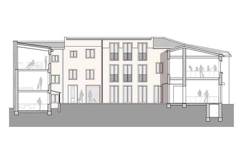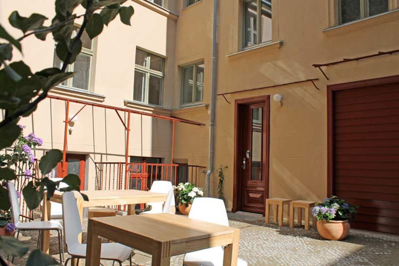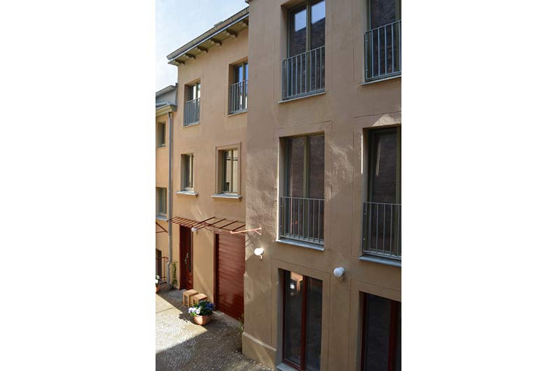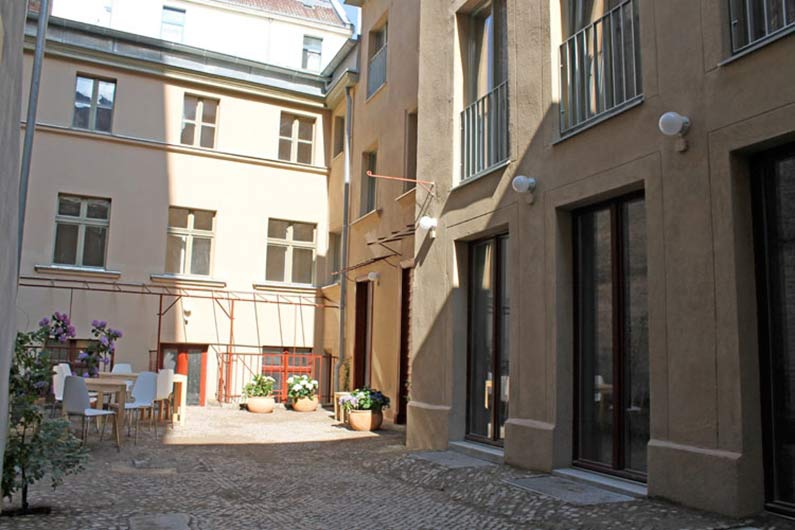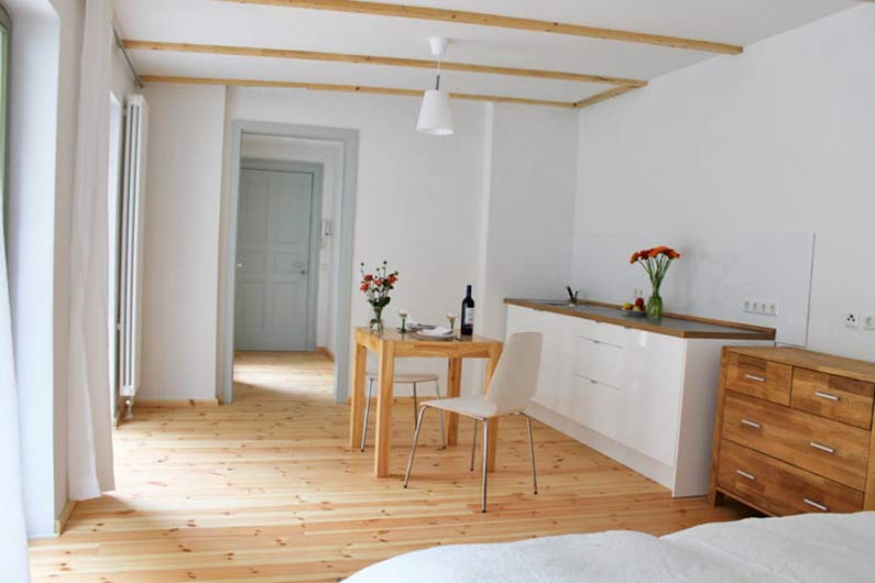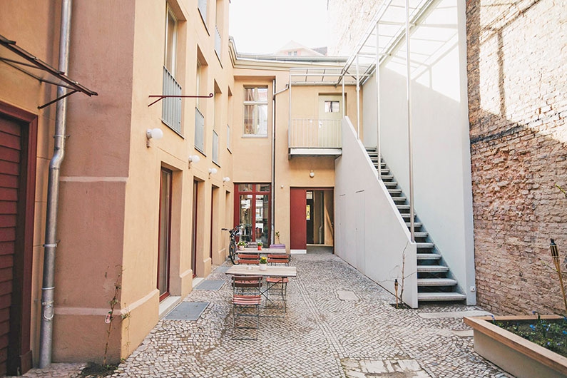 In erster Linie griffen wir hier die Wohnstruktur auf. Wir entwickelten 4 Einheiten, die sowohl als Wohnung als auch als Appartement funktionieren. Aus wirtschaftlichen Gründen mussten wir dann die Appartement-Lösung favorisieren. Wir verzichteten auf einzelne Stromzähler und fassten alles zu einer Einheit zusammen. Die Werkstatt im Erdgeschoss des Hinterhauses hatten wir ursprünglich für unser Büro vorgesehen. Für das Appartementkonzept bauten wir diesen Raum schließlich zur Kochwerkstatt und zum Gemeinschaftsraum aus. Es gibt einen Beamer, einen Kicker, einen Kaminofen und eine großzügige Küche.