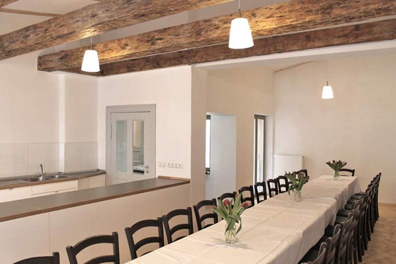 Aus dem Musikübungsraum im Obergeschoss des Vorderhauses gestalteten wir unseren Supperclub für Veranstaltungen jeder Art. Als Gestaltungselement hoben wir dort die wuchtigen Deckenbalken der Geschossdecke hervor, die nun frei im Raum zu sehen sind. Das Café im Erdgeschoss entstand auf der Fläche des ehemaligen Uhrenladens, für den wir eine Ersatzfläche im Nachbarhaus besorgten. Das Café profitiert von der einzigartigen Hofsituation.