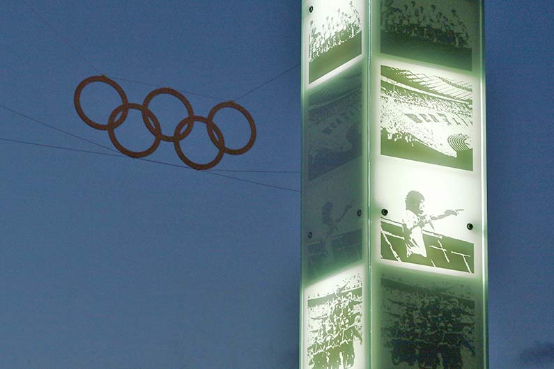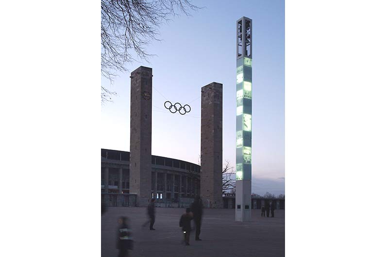 Das Preisgericht ist überzeugt davon, dass die räumliche Kraft, die formale Klarheit und Eigenständigkeit sowie die ausgeprägte Zeichenhaftigkeit des Entwurfs die Aufmerksamkeit der Stadiongäste zu gewinnen vermag. Als deutliche Abweichung von der vorhandenen Architektur und der vorgegebenen Achse stellt die Lichtskulptur als „Nadel" im Vorplatz einen gelungenen, gleichwohl zurückgenommenen Gegenakzent zu den Türmen des Olympischen Tores dar, ohne den Blick auf den historischen Ort zu verstellen.