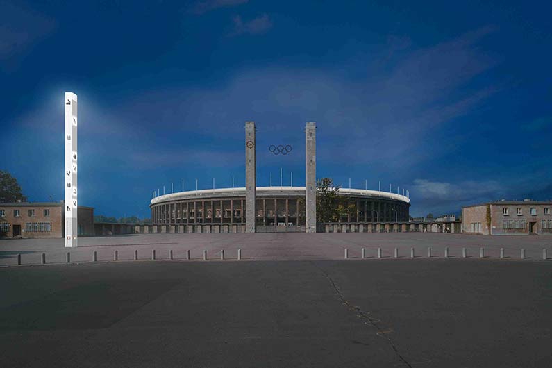 Das Preisgericht ist überzeugt davon, dass die räumliche Kraft, die formale Klarheit und Eigenständigkeit sowie die ausgeprägte Zeichenhaftigkeit des Entwurfs die Aufmerksamkeit der Stadiongäste zu gewinnen vermag. Als deutliche Abweichung von der vorhandenen Architektur und der vorgegebenen Achse stellt die Lichtskulptur als „Nadel" im Vorplatz einen gelungenen, gleichwohl zurückgenommenen Gegenakzent zu den Türmen des Olympischen Tores dar, ohne den Blick auf den historischen Ort zu verstellen.
